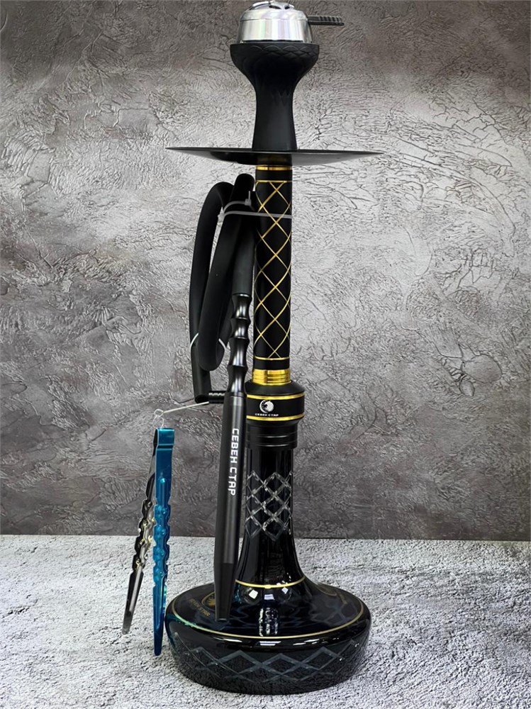 Кальян Seven Star 63 см - это элегантный и стильный аксессуар для курения табака. Он имеет высоту 63 см и выполнен в черно-золотом цветовом сочетании, что придает ему роскошный и изысканный вид.