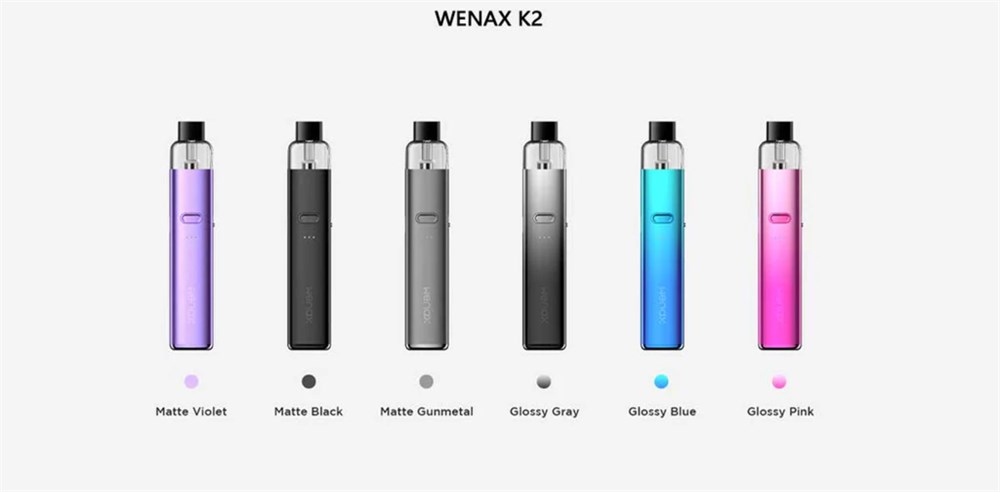 Компактная POD-система Wenax K2 с ориентацией на тугую затяжку от компании GeekVape. Устройство получило стильный прямоугольный корпус с закруглёнными краями, чип фирменной разработки с максимальной мощностью 18 Вт и переключаемым режимом подачи напряжения, а так же обновлённые картриджи с несколькими вариантами сопротивления. Материалом изготовления устройства послужил лёгкий алюминиевый сплав и пластик. Устройство активируется с помощью автоматического датчика затяжки, либо при помощи единственной управляющей кнопки. С помощью этой кнопки можно выбрать один из трёх возможных режимов выходной мощности и при необходимости включить/выключить систему. О текущем состоянии устройства сигнализирует ступенчатый светодиодный индикатор на передней грани корпуса девайса. За питание отвечает встроенный аккумулятор ёмкостью 1000 мач, подзарядить систему можно по средствам встроенного порта USB Type-C от источника питания с силой тока до 1А. На боковой грани присутствует слайдер для регулировки степени затяжки от средней до полноценно тугой. Съёмный картридж обладает резервуаром ёмкостью 2 мл с боковым клапаном для заправки, затяжка зависит от сопротивления - 0.8 Ом умеренно тугая и 1.2 Ом тугая MTL затяжка.